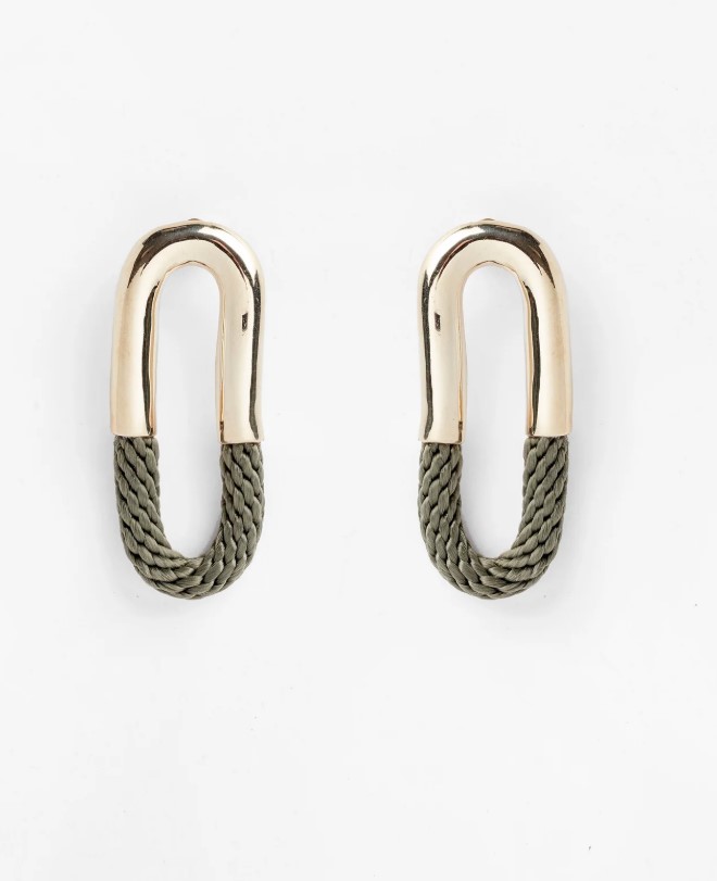 Curved brass earring looped with soft rope detail and finished with a titanium pin.