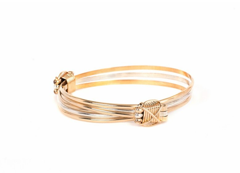 2 gold 1 silver strand bracelet with 2 gold knots 14k gold.