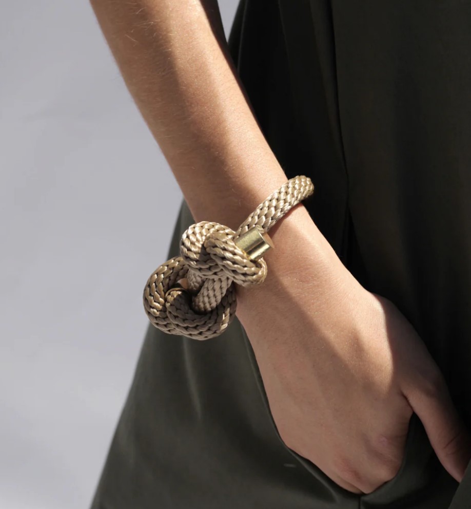 Braided rope finish with brass caps. This is an adjustable bracelet, can be tightened and loosened on the wrist accordingly.